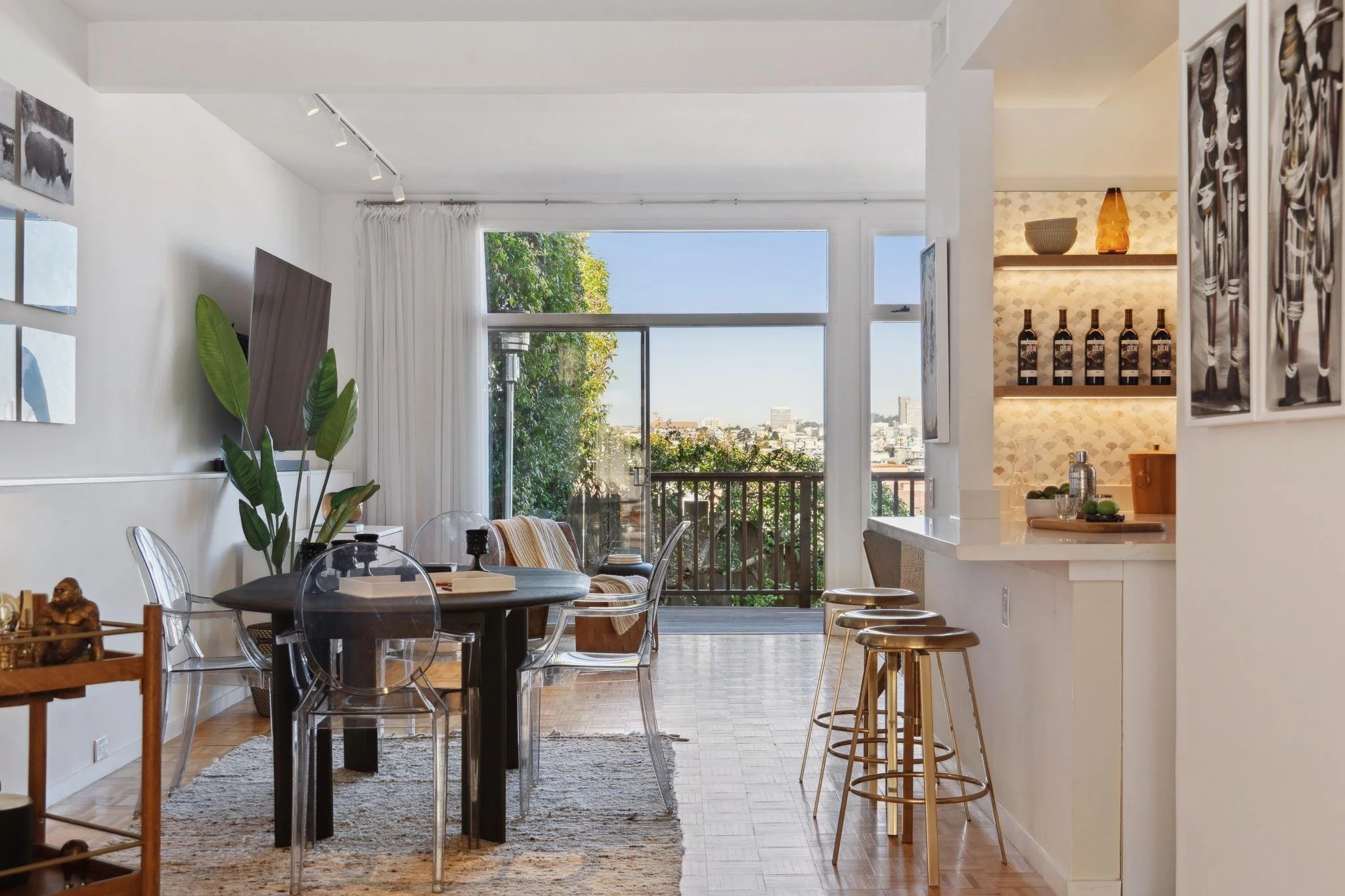 Prime Dolores Heights. Walls of glass. Skyline for days. Reimagined from its duplex roots into a luxurious single-family residence, 3838 19th Street delivers two dramatic levels of indoor–outdoor living with sweeping downtown views from virtually every vantage. A double-height entry atrium sets the tone, leading to grand, glass-wrapped living and dining spaces above and a lounge level that opens wide to a walk-out deck. Entertain at the show-stopping built-in bar clad in gorgeous artisan tile, or slide open the doors upstairs to a view balcony for sunset cocktails. An interior terrace and garden create a private backdrop for al-fresco dinners at scale. Add a wine cellar, laundry room, and rare 2-car, side-by-side carport, and you have the ultimate city home—equal parts polished, playful, and unmistakably San Francisco.